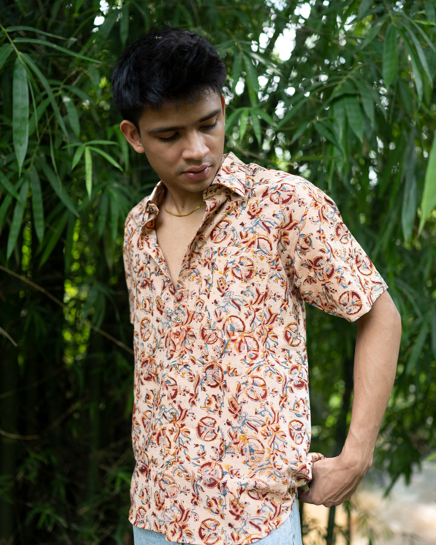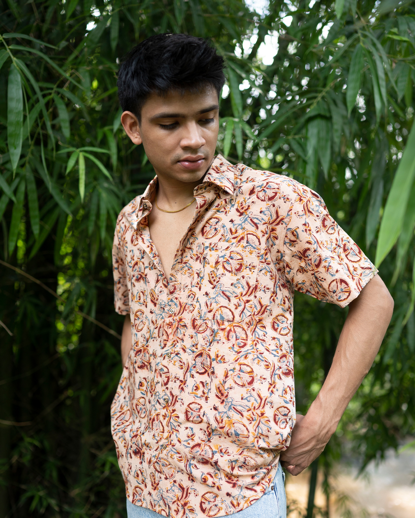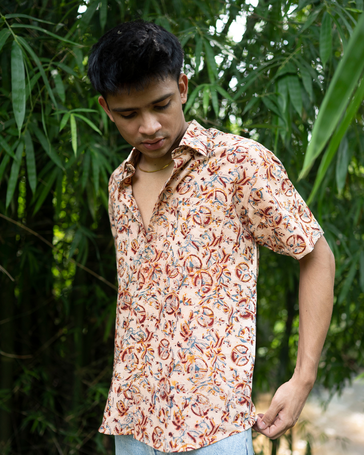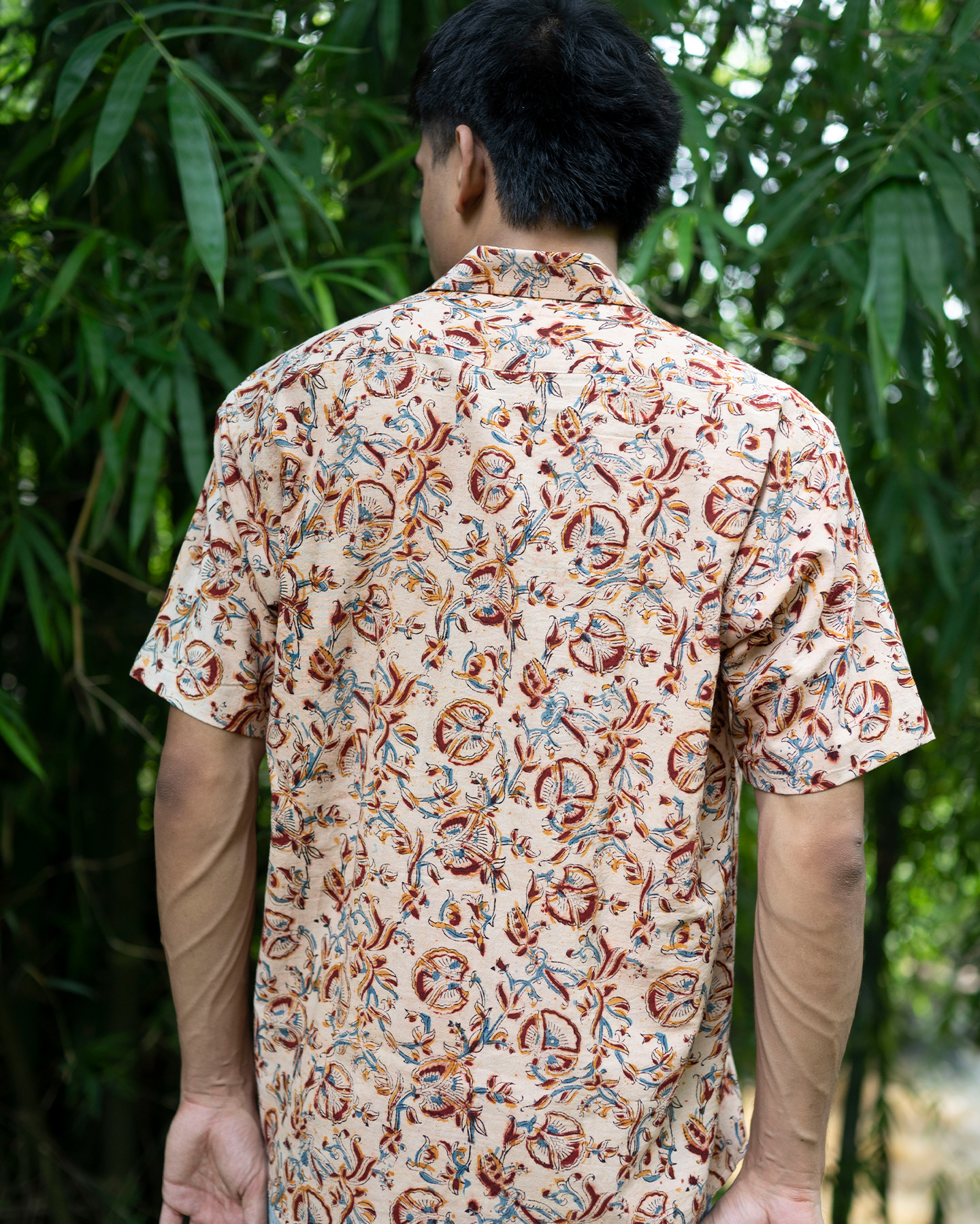 The Peachy Kalamkaari shirt is a breezy half-sleeve piece featuring intricate floral and bird motifs on a soft peach backdrop. Its handcrafted charm and airy fabric make it ideal for warm days and easygoing style.